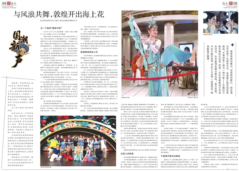 剧场的灯光暗下来,她侧躺在舞台上,长长的绸带铺开,营造出仙雾缭绕的意境。音乐响起,她缓缓起身,一颦一笑、一招一式,勾勒出天女俯视人间、为世人祈祷送福的画面,尽显敦煌舞的典雅与庄严。
