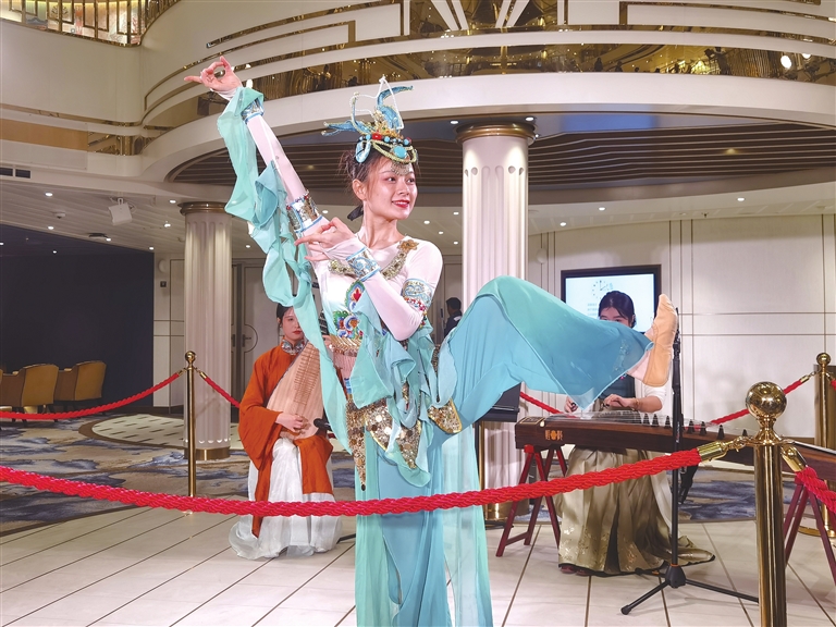 为了让观众更了解传统舞蹈,她还在邮轮上开设了小课堂,专门介绍敦煌舞与胡旋舞的区别。“敦煌舞源自中国壁画,风格偏宗教,氛围庄严。”她耐心地向观众解释,“而胡旋舞是经由丝绸之路传入中国的异域舞蹈,以旋转速度为核心,音乐轻快,充满西域风情。”