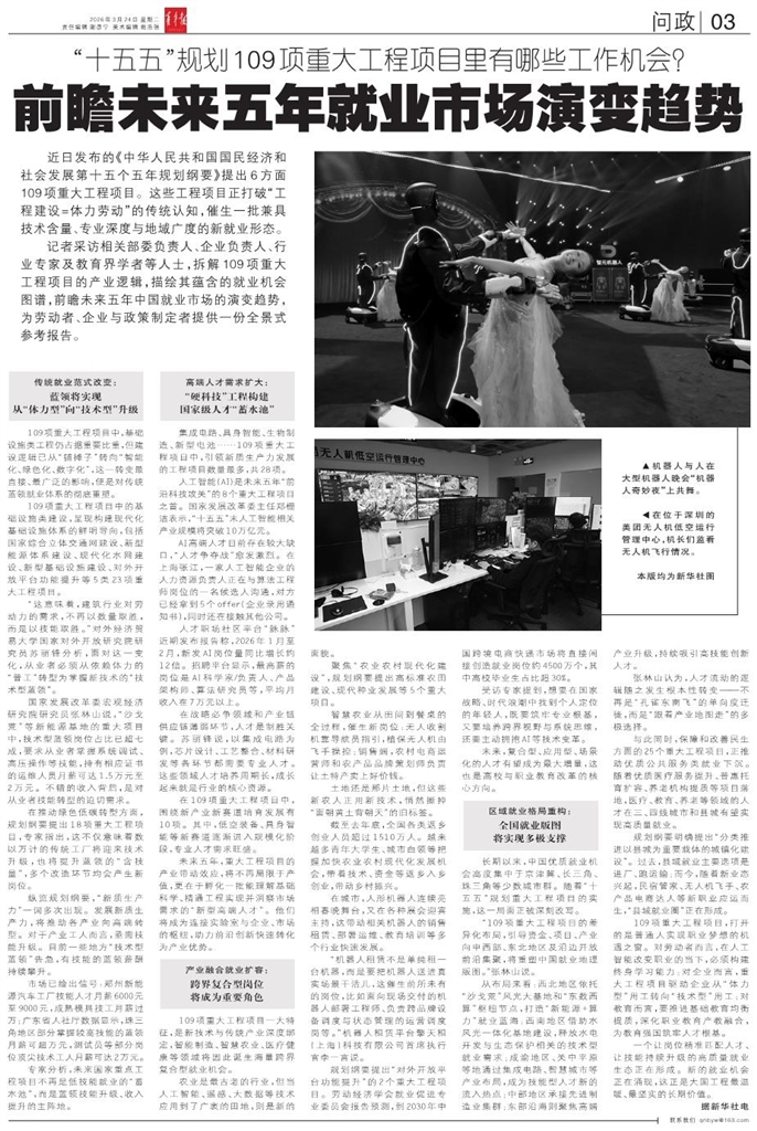 近日发布的《中华人民共和国国民经济和社会发展第十五个五年规划纲要》提出6方面109项重大工程项目。这些工程项目正打破“工程建设=体力劳动”的传统认知,催生一批兼具技术含量、专业深度与地域广度的新就