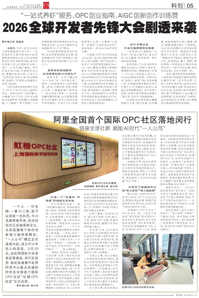 - 阿里全国首个国际OPC社区落地闵行 一个人、一台电脑、一套AI工具,就可以成就一支队伍,当AI浪潮席卷而来,创业的形态正在被重新定义,尤其是随着个体的创新潜力被持续释放,“一人公司”模式正在逐渐兴起,成为不少年轻人的首选。3月23日