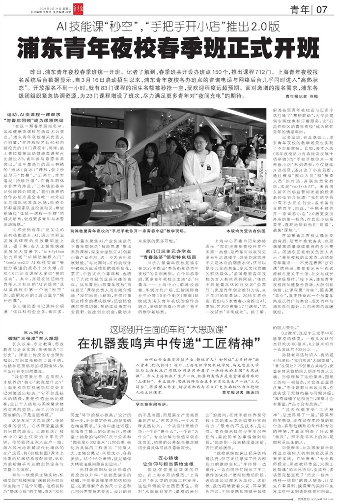 - 浦东青年夜校春季班正式开班 昨日,浦东青年夜校春季班统一开班。记者了解到,春季班共开设办班点150个,推出课程712门。上海青年夜校报名系统后台数据显示,自3月16日启动招生以来,浦东青年夜校各办班点的咨询电话与网络后台几乎