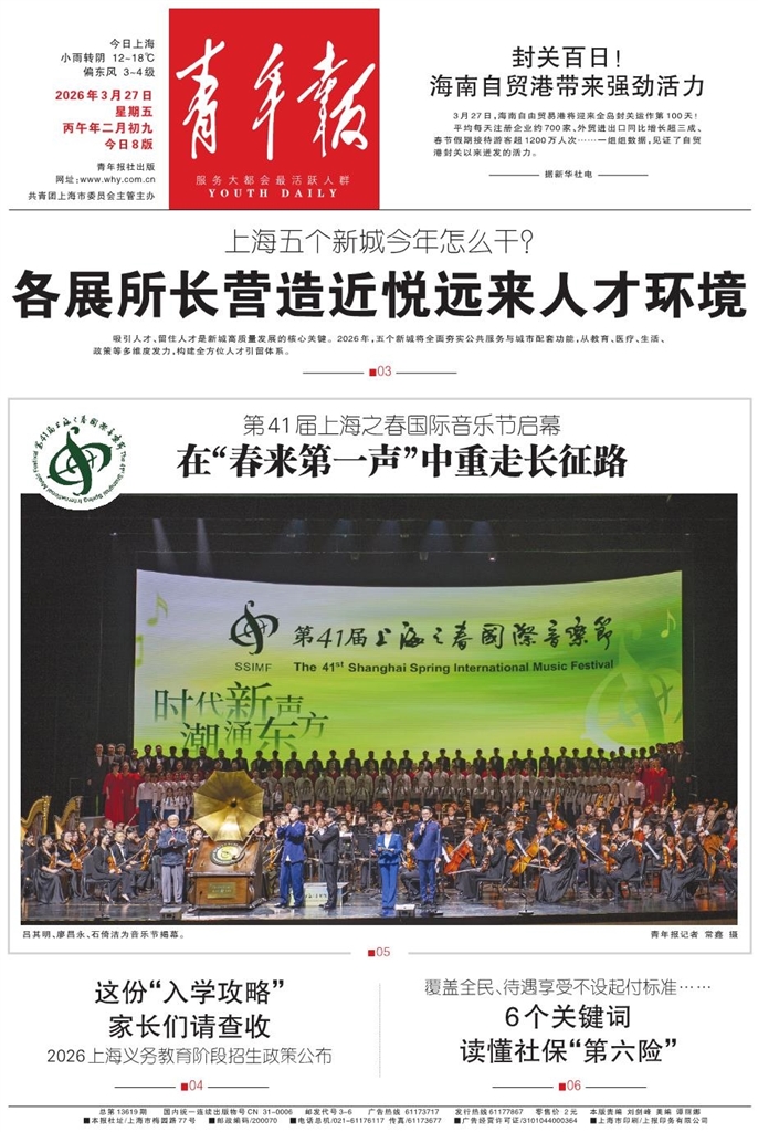 昨晚,第41届上海之春国际音乐节在北外滩友邦大剧院拉开帷幕。作为本届音乐节的开幕演出,由著名指挥家张国勇执棒,廖昌永、石倚洁等著名歌唱家领衔主演的“永恒的征途——纪念红军长征胜利90周年主题音乐会”隆重上演。今年是中国共产党成立105周年、红军长征胜利90周年,音乐会上半场的《长征组歌》和下半场的《爱永在》《灯火里的中国》等作品,形成了鲜明的呼应。“像《灯火里的中国》,是描绘今天在党的领导下中国特色社会主义建设所取得的伟大成就,其实是回应了《长征组歌》所歌唱的那一代人的奉献和追求,告慰我们的先烈:你们当年的理想今天都已实现。”廖昌永告诉记者。青年报记者 陈宏