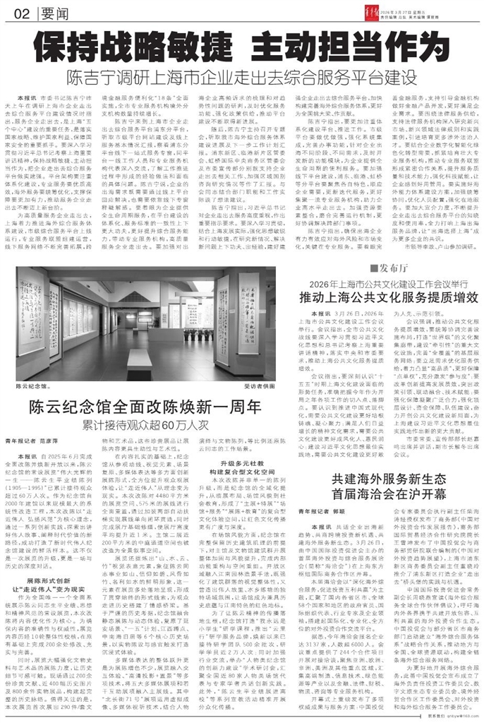 - 推动上海公共文化服务提质增效 本报讯 3月26日,2026年上海市公共文化建设工作会议举行。会议指出,全市公共文化战线要深入学习贯彻习近平文化思想和总书记考察上海重要讲话精神,落实中央和市委要求,推动上海公共文化服务提质增效。