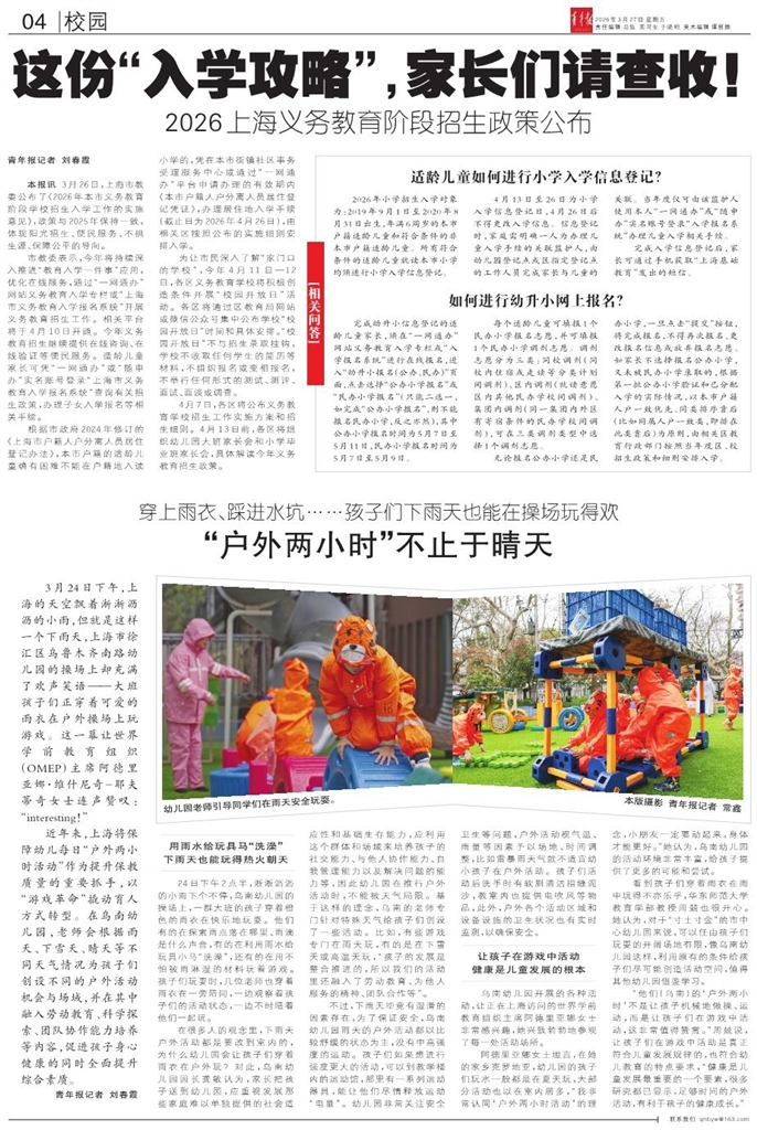 - 这份“入学攻略”,家长们请查收! 青年报记者 刘春霞 本报讯 3月26日,上海市教委公布了《2026年本市义务教育阶段学校招生入学工作的实施意见》,政策与2025年保持一致,体现阳光招生、便民服务、不挑生源、保障公平的导向。