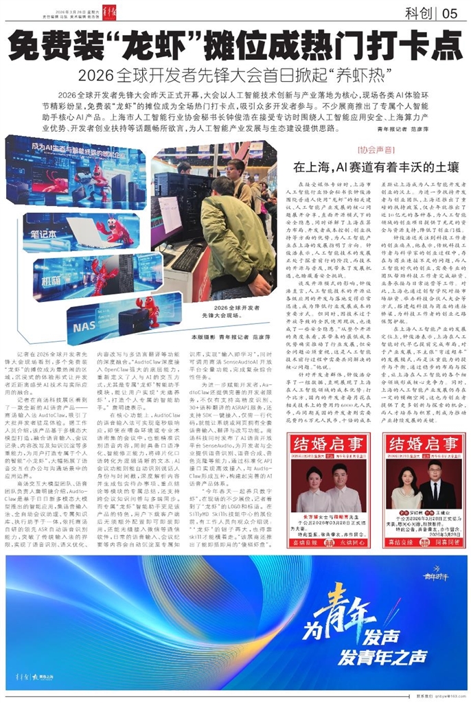 - 免费装“龙虾”摊位成热门打卡点 2026全球开发者先锋大会昨天正式开幕,大会以人工智能技术创新与产业落地为核心,现场各类AI体验环节精彩纷呈,免费装“龙虾”的摊位成为全场热门打卡点,吸引众多开发者参与。不少展商推出了专属个人智能