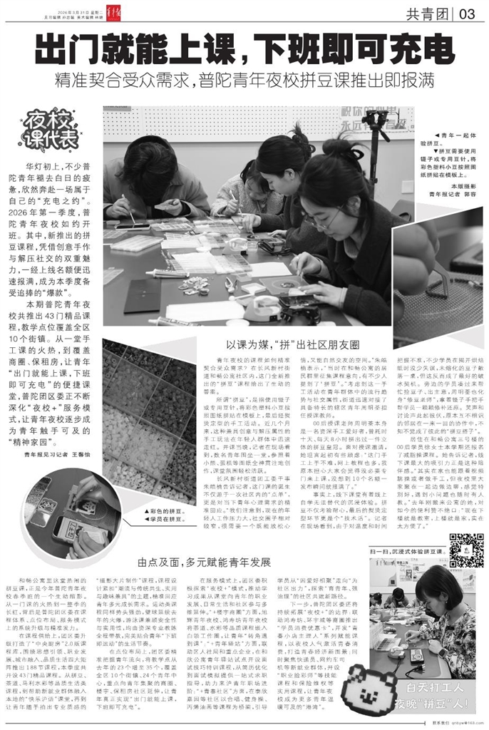 华灯初上,不少普陀青年褪去白日的疲惫,欣然奔赴一场属于自己的“充电之约”。2026年第一季度,普陀青年夜校如约开班。其中,新推出的拼豆课程,凭借创意手作与解压社交的双重魅力,一经上线名额便迅速报满