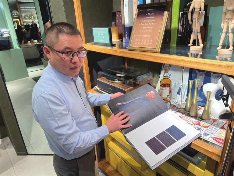 与卡利斯特(CALLISTO)相邻的蓝豹(LAMPO)门店,定制大师陈爱刚正耐心为顾客讲解。他坦言,现在店里约30%的定制订单均来自年轻群体,该比例呈逐年上升趋势。