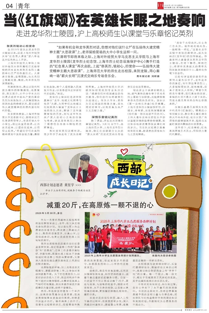 西部计划志愿者 黄星宇 毕业于上海商学院,现服务于西藏自治区拉萨市。 2026年3月30日,多云 作为一名曾在西藏林芝服役两年的退役解放军战士,去年,我又决定报