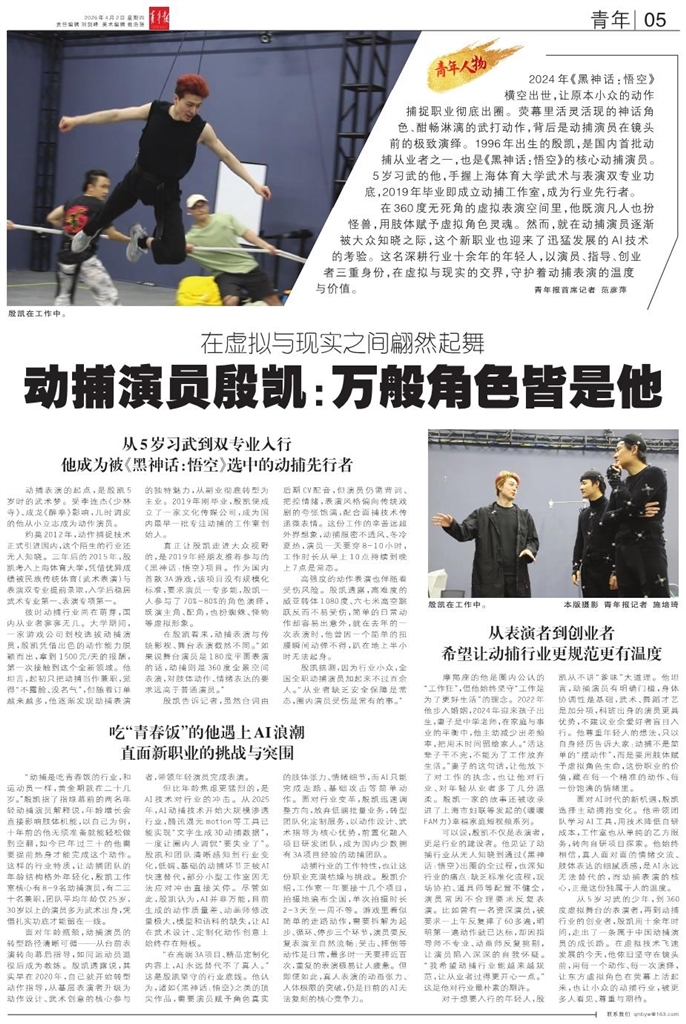 2024年《黑神话:悟空》横空出世,让原本小众的动作捕捉职业彻底出圈。荧幕里活灵活现的神话角色、酣畅淋漓的武打动作,背后是动捕演员在镜头前的极致演绎。1996年出生的殷凯,是国内首批动捕从业者之一