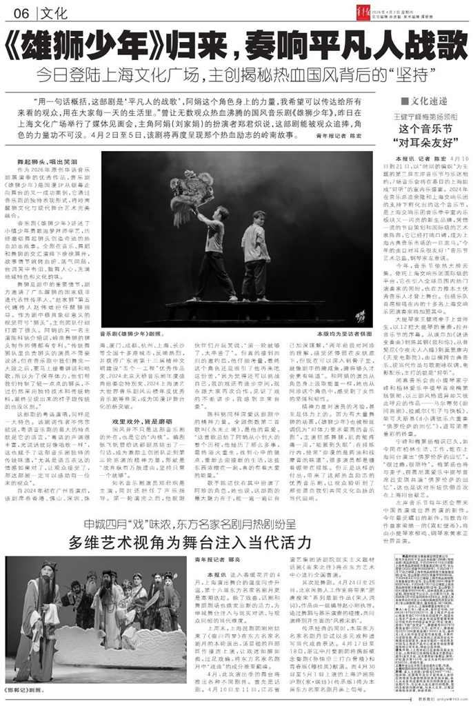 - 《雄狮少年》归来,奏响平凡人战歌 “用一句话概括,这部剧是‘平凡人的战歌’,阿娟这个角色身上的力量,我希望可以传达给所有来看的观众,用在大家每一天的生活里。”曾让无数观众热血沸腾的国风音乐剧《雄狮少年》,昨日在上海文化广场举行了媒