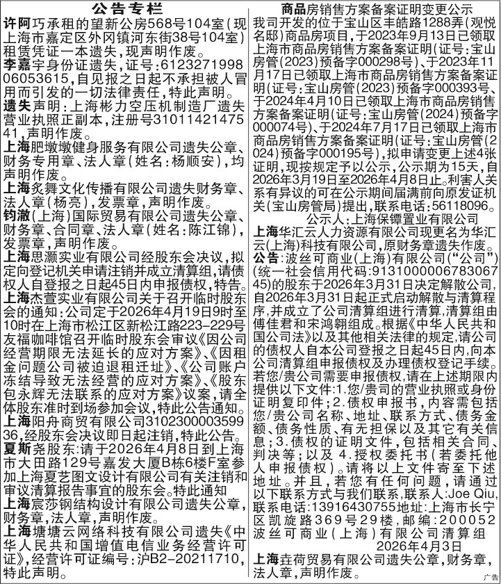 青年报文化 A06公告专栏 2026-04-03 2 2026年04月03日 星期五
