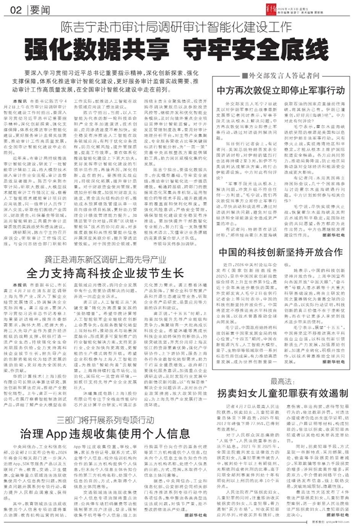 • 治理App违规收集使用个人信息   中央网信办、工业和信息化部、公安部2日发布公告称,2026年将会同相关部门进一步深入治理App、SDK等服务产品以及互联网广告、教育、交通、卫生健康、金融等重点领域违法违规收集使用个人信息典型问题