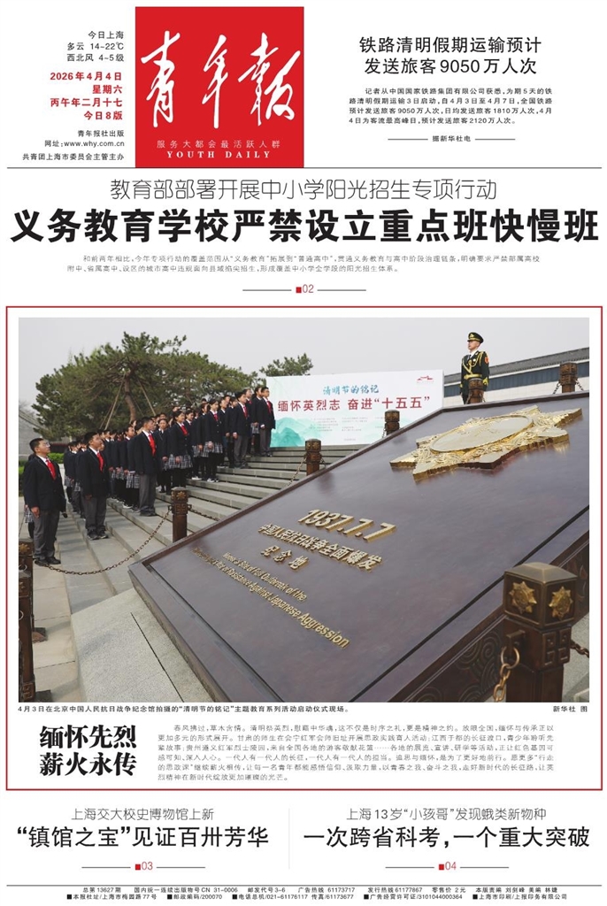 - 2026年4月4日 星期六 丙午年二月十七 今日8版 青年报社出版 网址:www.why.com.cn 共青团上海市委员会主管主办