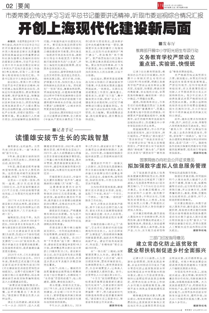 - 开创上海现代化建设新局面 本报讯 市委常委会昨天下午举行会议,传达学习习近平总书记在河北雄安新区考察并主持召开深入推进雄安新区高质量建设和发展座谈会时的重要讲话和在参加首都义务植树活动时的重要讲话精神,习近平总书记主持中共