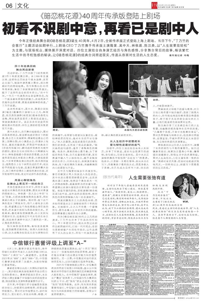 - 初看不识剧中意,再看已是剧中人 今年正值经典舞台剧《暗恋桃花源》诞生40周年,4月2日,全新传承版正式登陆上海上剧场。当日下午,“丁乃竺的会客厅”主题活动如期举行,上剧场CEO丁乃竺携手传承版主演隋棠、吴中天、林依晨、陈汉典,以