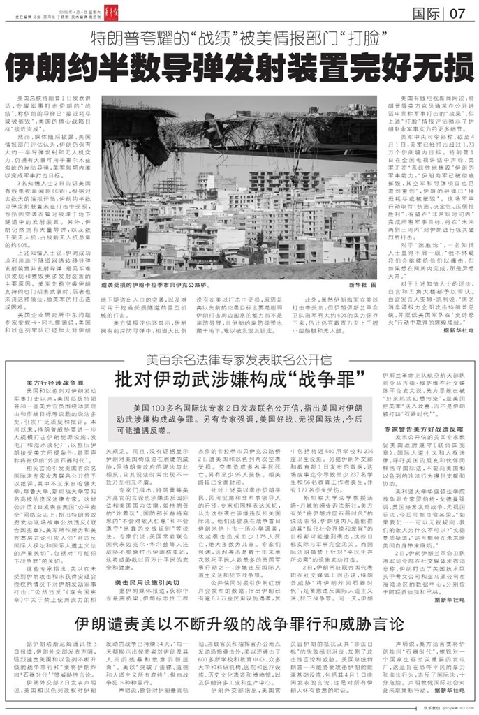 - 批对伊动武涉嫌构成“战争罪” 美国100多名国际法专家2日发表联名公开信,指出美国对伊朗动武涉嫌构成战争罪。另有专家强调,美国好战、无视国际法,今后可能遭遇反噬。 美方行径涉战争罪 美国和以色列对伊朗发