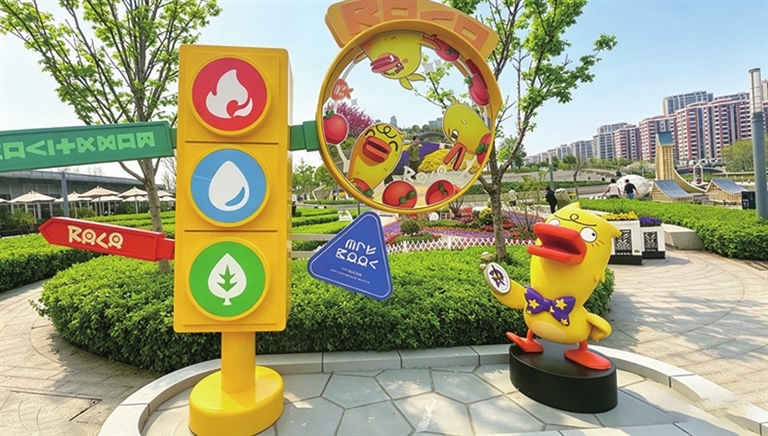 记者在现场看到,从公园入口步入主干道后,沿线已经设置了多处游戏角色装置和拍照点位。靠近四季花丘一带,巨型“迪莫”装置立在开阔草坪旁,不少年轻人和亲子家庭排队合影;绿色剧场周边,分布着“鸭吉吉”等角色打卡点;沿途的绿意中,还散落着多处隐藏打卡点与拍照相框。