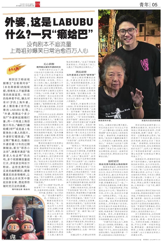 刷到百万粉丝视频博主“全能蒋同学”(本名蒋祺琛)的短视频,很难有人不被屏幕里的画面逗笑。95后的他举着手机,镜头对准81岁的上海外婆,桌上摆放着Z世代追捧的LABUBU玩偶:“外婆,侬猜这个多少钱
