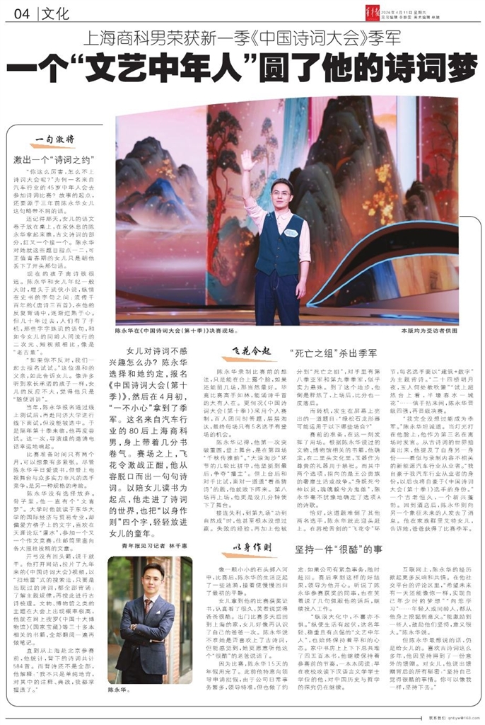 女儿对诗词不感兴趣怎么办?陈永华选择和她约定,报名《中国诗词大会(第十季)》,然后在4月初,“一不小心”拿到了季军。这名来自汽车行业的80后上海商科男,身上带着几分书卷气。赛场之上,飞花令激战正酣