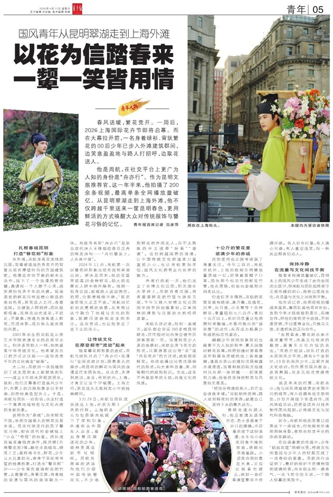 春风送暖,繁花竞开。一周后,2026上海国际花卉节即将启幕。而在大幕拉开前,一名身着绿衫、背驮繁花的00后少年已步入外滩建筑群间,边笑意盈盈地与路人打招呼,边取花送人。 他是周航,在社交平台上