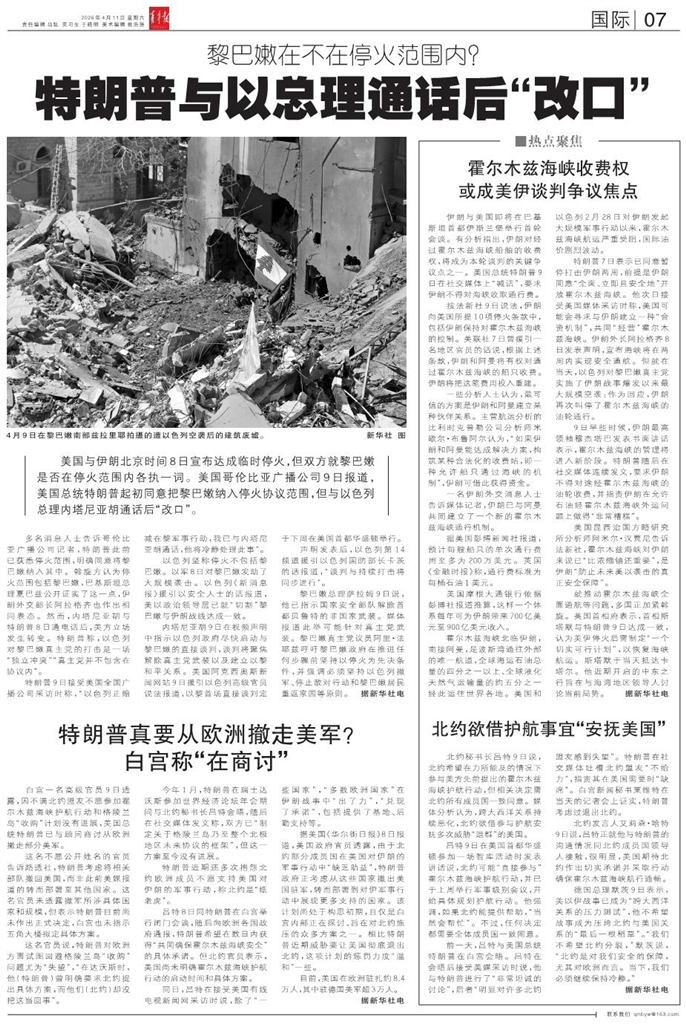 - 特朗普与以总理通话后“改口” 美国与伊朗北京时间8日宣布达成临时停火,但双方就黎巴嫩是否在停火范围内各执一词。美国哥伦比亚广播公司9日报道,美国总统特朗普起初同意把黎巴嫩纳入停火协议范围,但与以色列总理内塔尼亚胡通话后“改口”
