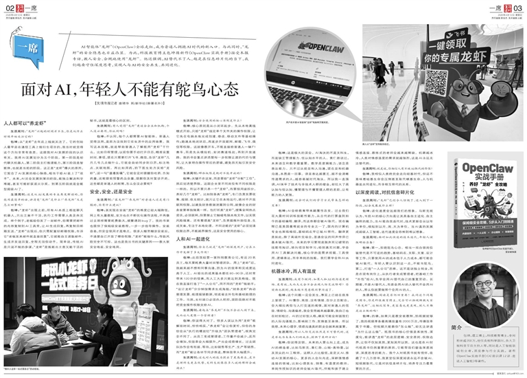 【文/青年报记者 唐骋华 图/新华社(除署名外)】 AI智能体“龙虾”(OpenClaw)全球走红,成为普通人拥抱AI时代的新入口。与此同时,“龙虾”的安全隐患也日益凸显。为此,科技教育博主包
