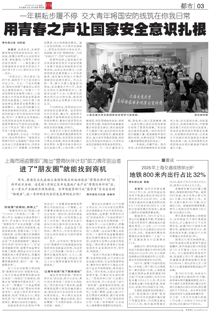 - 用青春之声让国家安全意识扎根 青年报记者 刘昕璐 本报讯 走进社区,为居民解读身边的国家安全知识;深入校园,给青少年带去生动的安全科普;奔赴基层,与青年干部共话安全使命……上海交通大学总体国家安全观宣讲团成立于2025年4