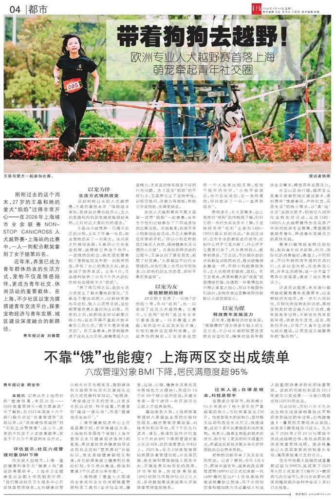 - 带着狗狗去越野! 刚刚过去的这个周末,27岁的王晶和她的爱犬“焰焰”过得非常开心——在2026年上海城市业余联赛NON-STOP CANICROSS人犬越野赛·上海站的比赛中,一人一狗配合默契拿到了女子组第四名。