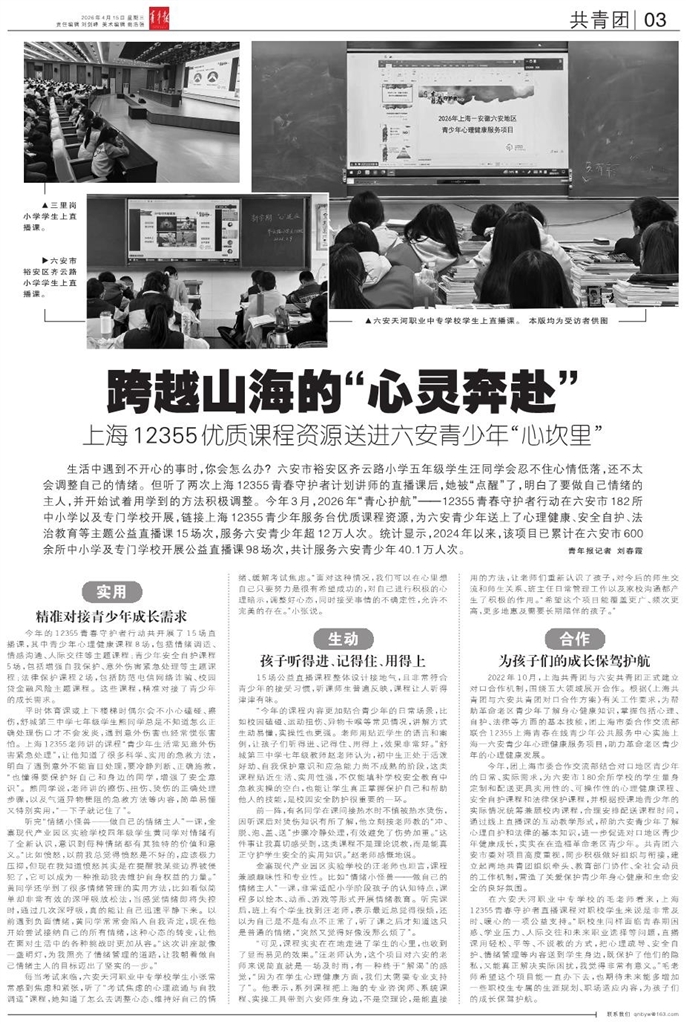 生活中遇到不开心的事时,你会怎么办?六安市裕安区齐云路小学五年级学生汪同学会忍不住心情低落,还不太会调整自己的情绪。但听了两次上海12355青春守护者计划讲师的直播课后,她被“点醒”了,明白了要做