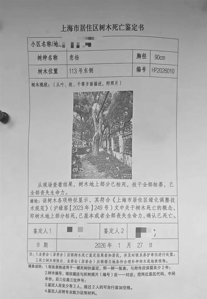 鉴定书上写得清清楚楚:“地上部分已枯死,枝干全部枯萎,已全部丧失生命力。”结论那一栏还引经据典,搬出了《上海市居住区绿化调整技术规范》,证明我死得合规、死得标准、死得有法可依。