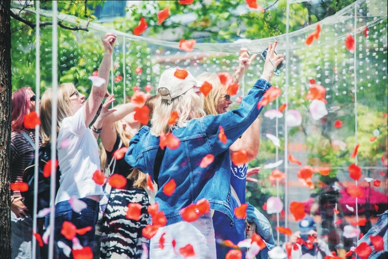 “中午时分到达现场,停车找了40分钟,感觉就连前滩中央花园各个缝隙都站满了人。”95后游客小林分享道,虽然话风稍显夸张,但所言非虚。水泄不通的现场,被网友直呼“感觉有一个亿的人潮”。她和朋友是专程从嘉定自驾赶来的。前滩公园巷红色的地标装置“无尽之旋”下,一只巨型的花束兔子完美复刻了《爱丽丝梦游仙境》,特别吸睛,她将美照转发在朋友圈里,向朋友们分享这份热闹的春日氛围。