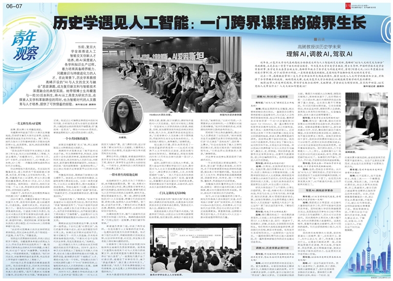 - 历史学遇见人工智能:一门跨界课程的破界生长 当前,复旦大学全面推进人工智能交叉创新人才培养,将AI深度嵌入各学科知识生产过程,着力培育具备跨界能力、问题意识与持续进化力的人才。在此背景下,历史学系教授高晞开设的“AI与人文的交叉与融合”思政
