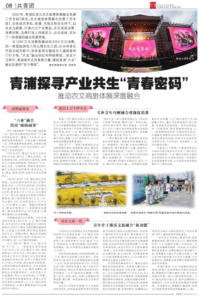 2025年,青浦区成立农文旅商体展融合发展工作专班(现名:农文商旅体展融合发展工作专班),在各成员单位、街镇、市场主体的支持下,以农业为根基、打通六大产业壁垒,在引流促消费、场景创新、品牌打造上持