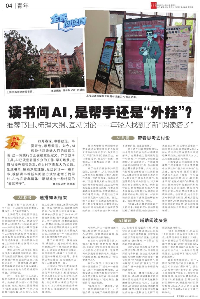 四月春深,书香致远。书页开合,思想激荡。如今,AI已经悄然走进人们的阅读生活,这一传统行为正在被重新定义。作为效率工具,AI已浸润普通公众的工作、学习场景,运用AI提升阅读效率,成为时下青年人的关