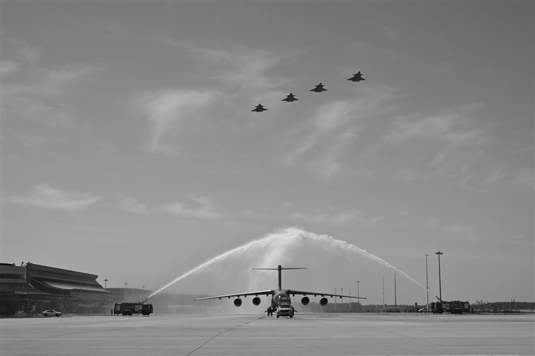 22日上午,中韩双方在韩国仁川国际机场举行志愿军烈士遗骸交接仪式。9时50分许,呼号为“荣归50”的运-20B起飞。进入中国领空后,呼号为“红鹰”的4架歼-20迎接护航,“双20”列阵长空致以崇高敬意。11时25分,运-20B平稳降落在辽宁沈阳桃仙国际机场,机场以“过水门”最高礼遇为英灵洗尘。
