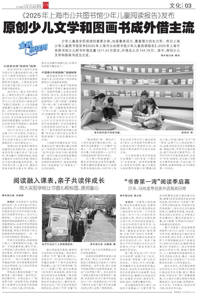 - 原创少儿文学和图画书成外借主流 少年儿童是全民阅读的重要主体,也是最具活力、最富潜力的生力军。昨日上海少年儿童图书馆发布《2025年上海市公共图书馆少年儿童阅读报告》,2025年上海市各图书馆少儿图书外借总量1511.54万册次
