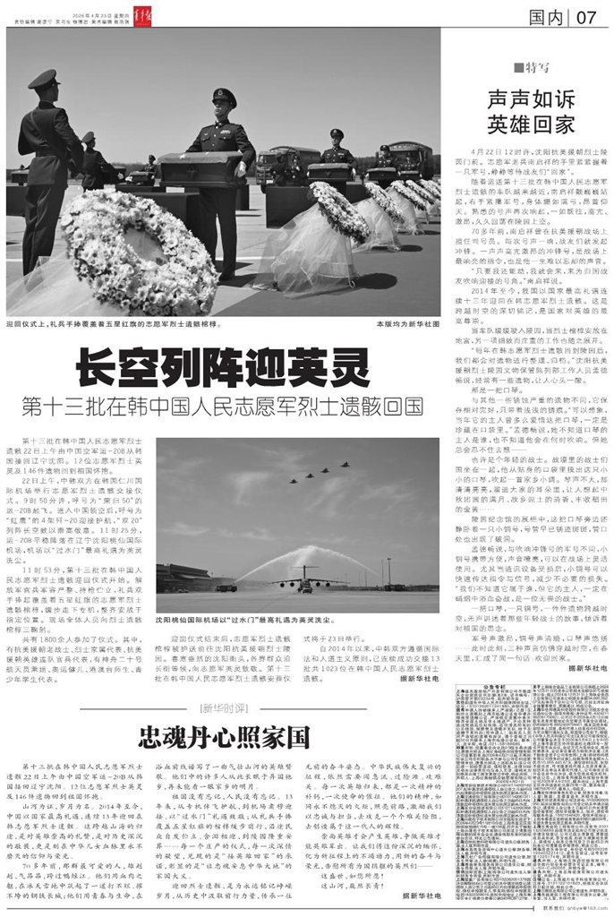 - 忠魂丹心照家国 第十三批在韩中国人民志愿军烈士遗骸22日上午由中国空军运-20B从韩国接回辽宁沈阳。12位志愿军烈士英灵及146件遗物回到祖国怀抱。 山河为证,岁月为名。2014年至今,中国以国家最高礼遇,连