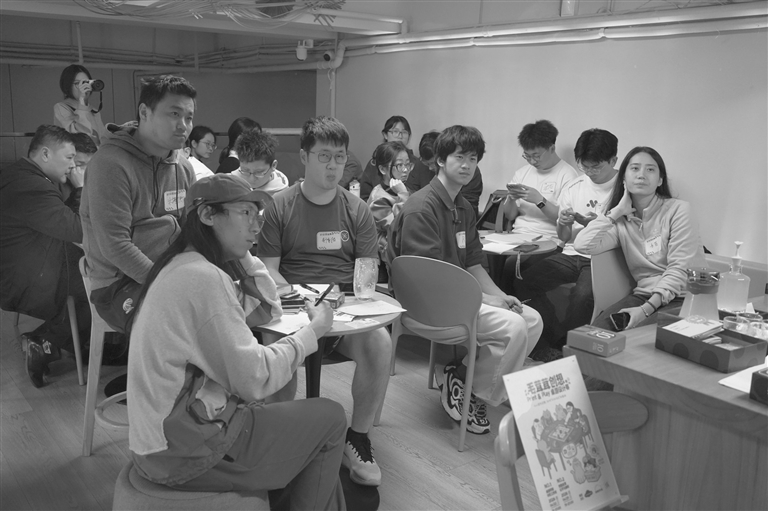 在宠物友好空间“醒象日咖夜酒”,还举行了一场以“人宠友好”为主题的桌游共创活动。社区工作者在现场分享了社区里流浪猫的生存现状与治理痛点。青年围坐在一起讨论,尝试将流浪猫治理、文明养宠等邻里协商规则转化为桌游机制,让宏大的“人宠和谐”议题被巧妙地拆解落地。