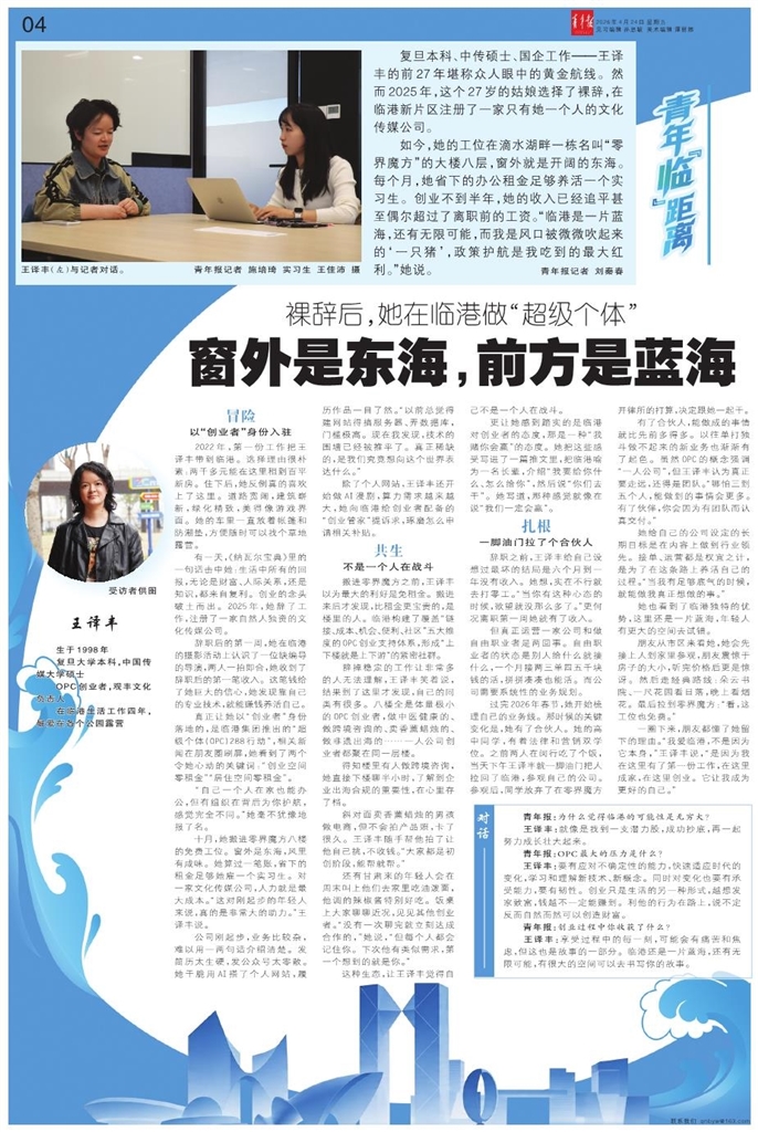复旦本科、中传硕士、国企工作——王译丰的前27年堪称众人眼中的黄金航线。然而2025年,这个27岁的姑娘选择了裸辞,在临港新片区注册了一家只有她一个人的文化传媒公司。 如今,她的工位在