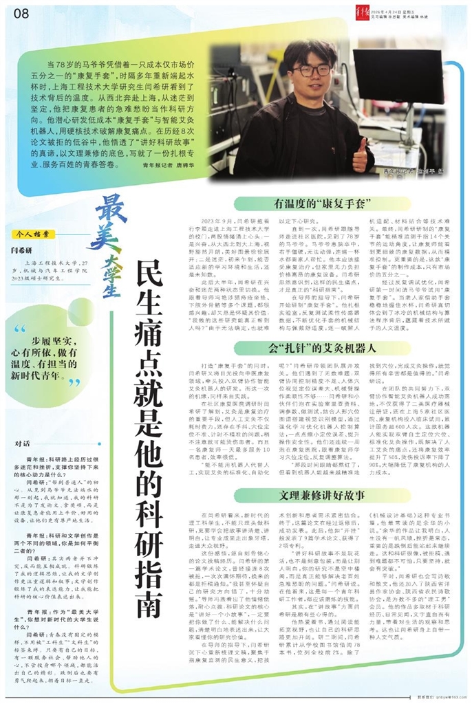 当78岁的马爷爷凭借着一只成本仅市场价五分之一的“康复手套”,时隔多年重新端起水杯时,上海工程技术大学研究生闫希研看到了技术背后的温度。从西北奔赴上海,从迷茫到坚定,他把康复患者的急难愁盼当作科研