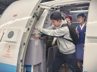 在VR灭火应急处置体验区,逼真的虚拟火情场景让同学们不禁屏息凝神。通过模拟机上突发火情,客舱部业务室教员手把手教同学们如何使用灭火器以及舱内疏散注意事项等内容。步入1:1还原的模拟客舱,同学们触摸机上设备、学习氧气面罩使用方法,还在乘务员的讲解中了解颠簸处置、医疗急救等专业知识。当听到“乘务员每年需完成近百项复训考核”时,同学们很受震撼:“对安全的执着,是对生命的至高敬畏。”