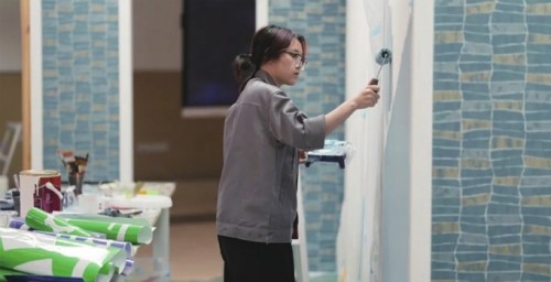 比赛现场,5位参赛选手化身“空间魔法师”在油漆与装饰的世界里展开巅峰对决。他们全神贯注于手中的工具,将专业技能发挥得淋漓尽致。通过字母印刷模块、网格放大环节、竞速比拼、自由创意、裱糊墙纸五个模块层层递进,全方位展现了油漆与装饰工艺的多元魅力与无限潜力。