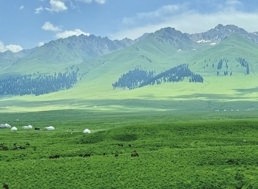 在新疆,你还能欣赏到能最先见到太阳的地方——那拉提。那里的天很低,仿佛伸手就能摸到;那里的云也是千姿百态,刚刚还是条奔跑中的小狗,一眨眼的功夫就变成了一朵花。极目远眺。草原上有许多圆圆的点,那是哈萨克人民的毡房。阳光下,那些毡房仿佛是散落在草原上的钻石。