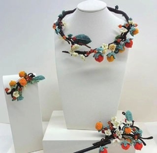 本次参展的《匠心雕琢,创意绽放》系列作品,以材料为基、创意为魂,构建多元设计语境。其中,《小“柿”一桩》将中国传统的绳结技艺与当代造型语言相融合,以细腻的手工编织出柿子的生动形态,既延续了非遗手工艺的温度,又赋予其简约现代的视觉表达。作品《与时俱进》以二十四节气为灵感,运用3D建模起版、传统金工等首饰工艺,体现“天人合一”的东方哲学在当下的设计转译。