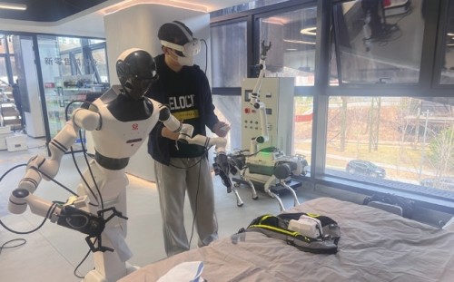 技术人员在给人形机器人做训练。