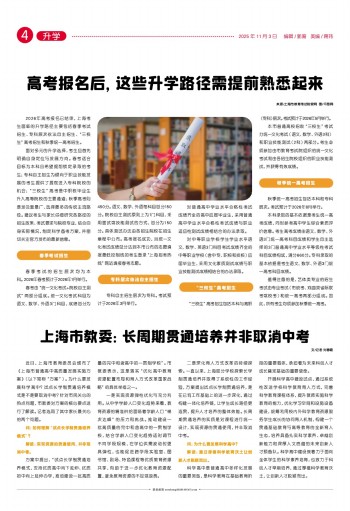 二是深化育人方式改革的持续探索。一直以来,上海部分学校探索长学制贯通培养并取得了系统性的工作经验,方案提出试点长学制贯通培养,是在已有工作基础上的进一步深化,通过构建一体化培养链,让学生成长路径更连贯,提升人才培养的整体效能。长周期贯通培养的实质是对课程进行统一设计,实现资源的贯通使用,并非取消中考。