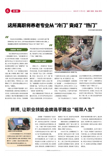 “毕业生100%实现就业、入职前考取三级技能证……从2019年沪上首个高职养老专业‘试水’仅40人,到今年自主招生放号40个却吸引400多人报名,上海城建职业学院用六年时间把养老这个专业从‘冷门’变成了‘热门’。”