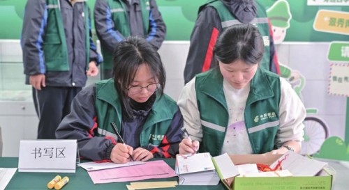 在景秀高级中学,学校已将一间教室打造成了一家小型邮局,门口卡通造型的“邮筒弟”也正式“上岗”迎客。书写区同学们排起长队,认真书写着对亲友的真挚情谊;盖章台边一个个纪念戳在信封上留下独特印记,热闹而温馨的场景尽显书信文化的魅力。