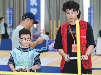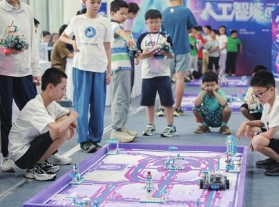 来自全市百所中小学的近2000名学生参加了“AI智创未来”选拔赛。赛事中,“文明启航”“冰壶运动会”“天外信息战”三大项目要求学生综合运用结构搭建、逻辑编程、图像识别等跨学科知识,搭建并操控机器人现场完成指定任务;该赛道深度融合机械结构、人工智能、编程及科技硬件知识,让学生在动手实践中深入探索AI与机械融合的奥秘。
