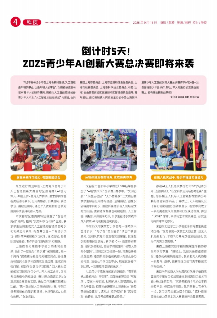 习近平总书记今年在上海考察时强调,“人工智能是年轻的事业,也是年轻人的事业”。为积极响应总书记对青年人的殷切嘱托,积极为人工智能领域储备青少年人才,以“人工智能从娃娃抓起”为宗旨,由共青团上海市委员会、上海市经济和信息化委员会、上海市教育委员会、上海市科学技术委员会、中国(上海)自由贸易试验区临港新片区管理委员会指导,青年报社、南汇新城镇人民政府主办的中国·上海第八届青少年人工智能创新大赛总决赛将于9月20日-21日在临港少年宫举行。那么,不久前进行的三场选拔赛上,都有哪些精彩故事呢?